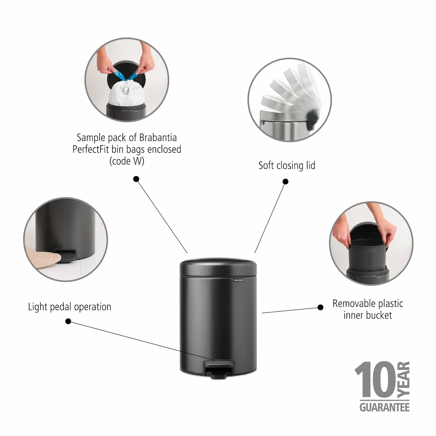 AutorizētiesBrabantia Pedal Bin NewIcon 5 litri ir ne tikai stilīga un higiēniska atkritumu tvertne, bet arī ļoti kvalitatīva un izturīga. Izturīgs un droša pateicoties neslīdošajai pamatnei. Vāks nelaiž cauri smakas, viegli aizveras un atveras, piespiežot atkritumu tvertnes pedāli ar pēdu. Dizaina elements, kas lieliski iederas jūsu vannas istabā, tualetē vai bērnistabā – vai jebkurai citā telpā, kurā var izmantot lielisko mazo atkritumu tvertni!