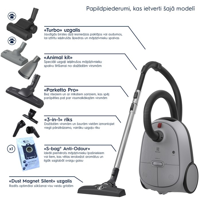 Animal 600 putekļu sūcēja ar putekļu maisiņu uzgaļa auto grīdas režīms nozīmē netraucētu darbību un redzamus rezultātus. Komplektā ietilpst piederumi mājdzīvnieku spalvu ērtai savākšanai.