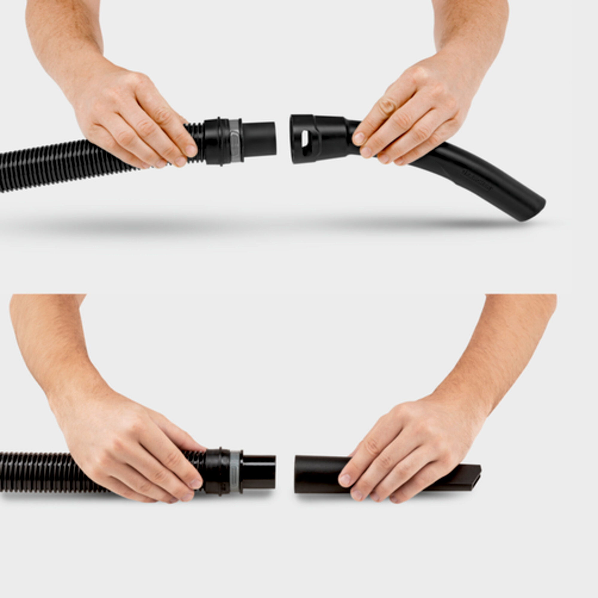 Dažādus uzgaļus var pievienot tieši pie iesūkšanas šļūtenes. Ērtai tīrīšanai ar putekļsūcēju pat šaurās vietās.