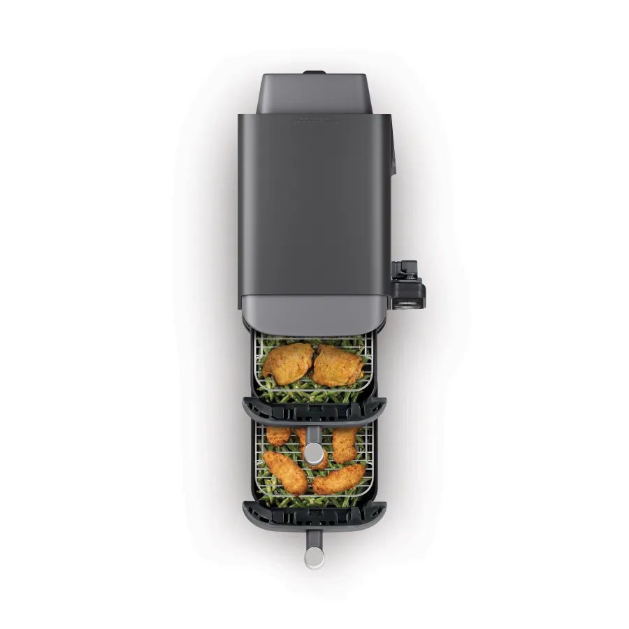Ar divām gatavošanas atvilktnēm, kas ir saliktas viena virs otras, šis kompaktais dubultais karstā gaisa friteris ir par 30% šaurāks, salīdzinājumā ar modeli AF400, taču tam joprojām ir liela ietilpība. Lieliski piemērots mazām virtuvēm, lielām ģimenēm un ikvienam, kam patīk uzņemt viesus, nodrošinot pietiekami daudz ēdiena vairāk nekā 8 cilvēkiem. Tā augstums ir 38.5 cm, tāpēc tas ērti iederas zem virtuves skapjiem.