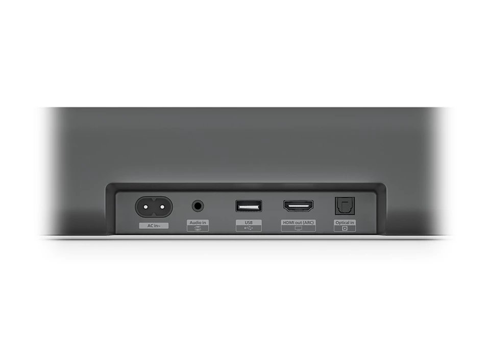 Šis elegantais SoundBar skaļrunis lieliski izskatās jebkurā telpā, un kompakto basu skaļruni var viegli paslēpt. Vai televizors ir piestiprināts pie sienas? Arī skaļruni var uzstādīt pie sienas ar noņemamiem kronšteiniem (iekļauti komplektā).
