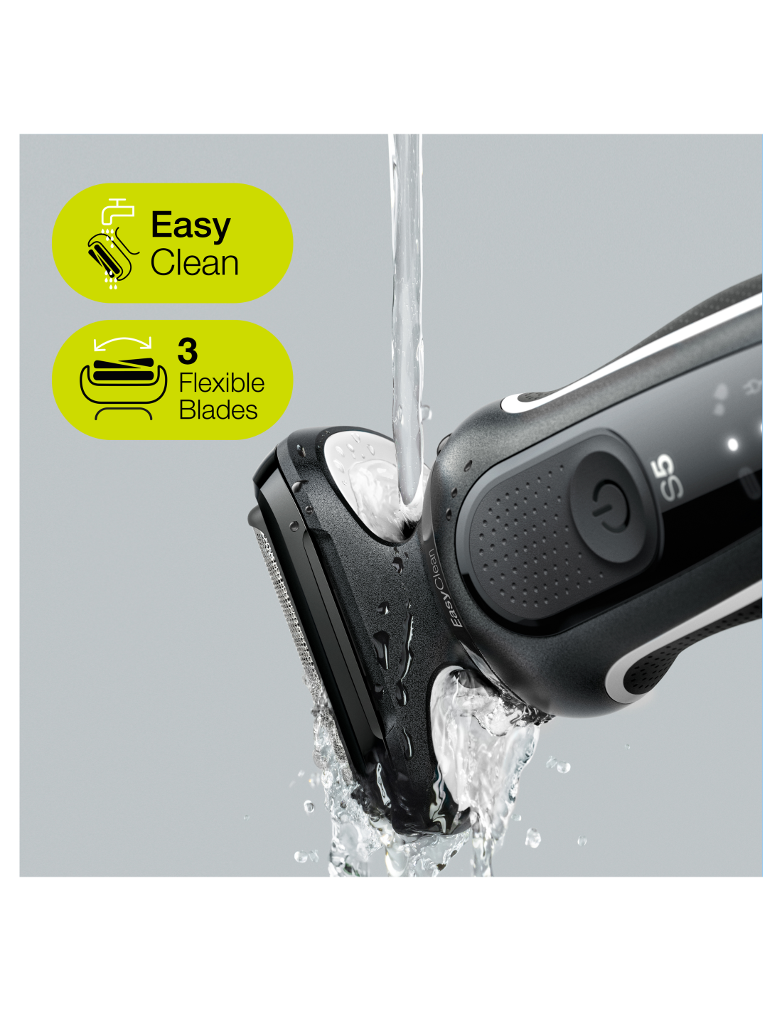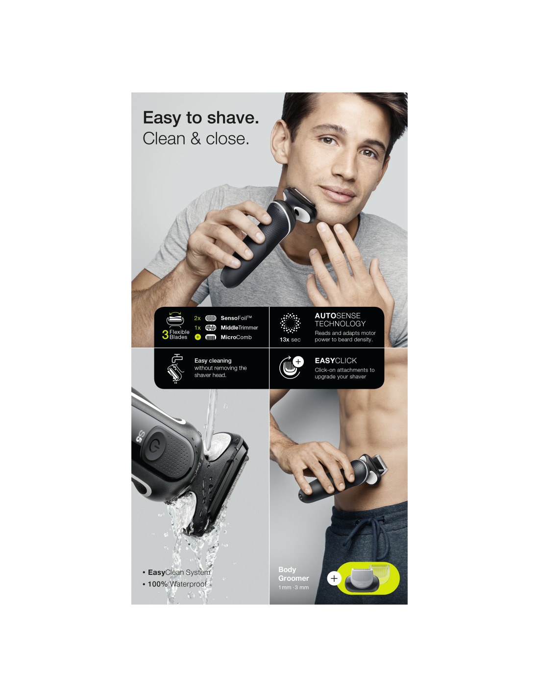 Šī elektriskā skuvekļa 3 elastīgie asmeņi pielāgojas jūsu sejas kontūrām, savukārt Easyclean sistēma ļauj ātri un vienkārši tīrīt - bez nepieciešamības noņemt skuvekļa galvu.