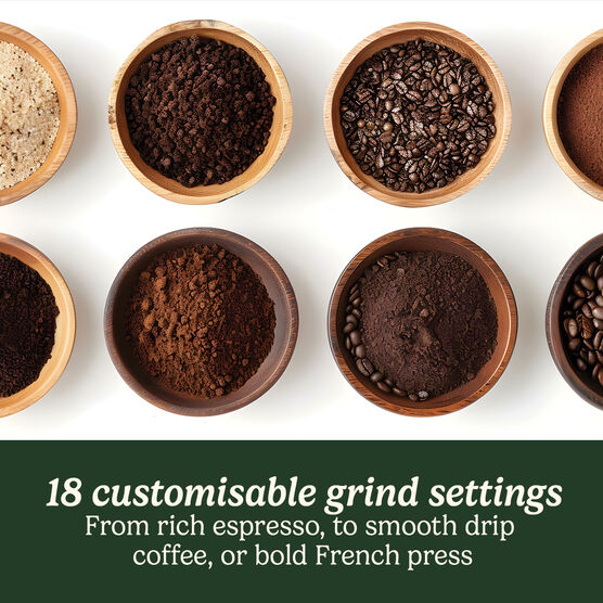Apgrieziet un samaliet: Vienkārši pagrieziet pupiņu tvertni vienā no 18 maluma iestatījumiem un pielāgojiet malumu savai brūvēšanas metodei, sākot no īpaši smalka espresso līdz rupjam aukstajai kafijai.